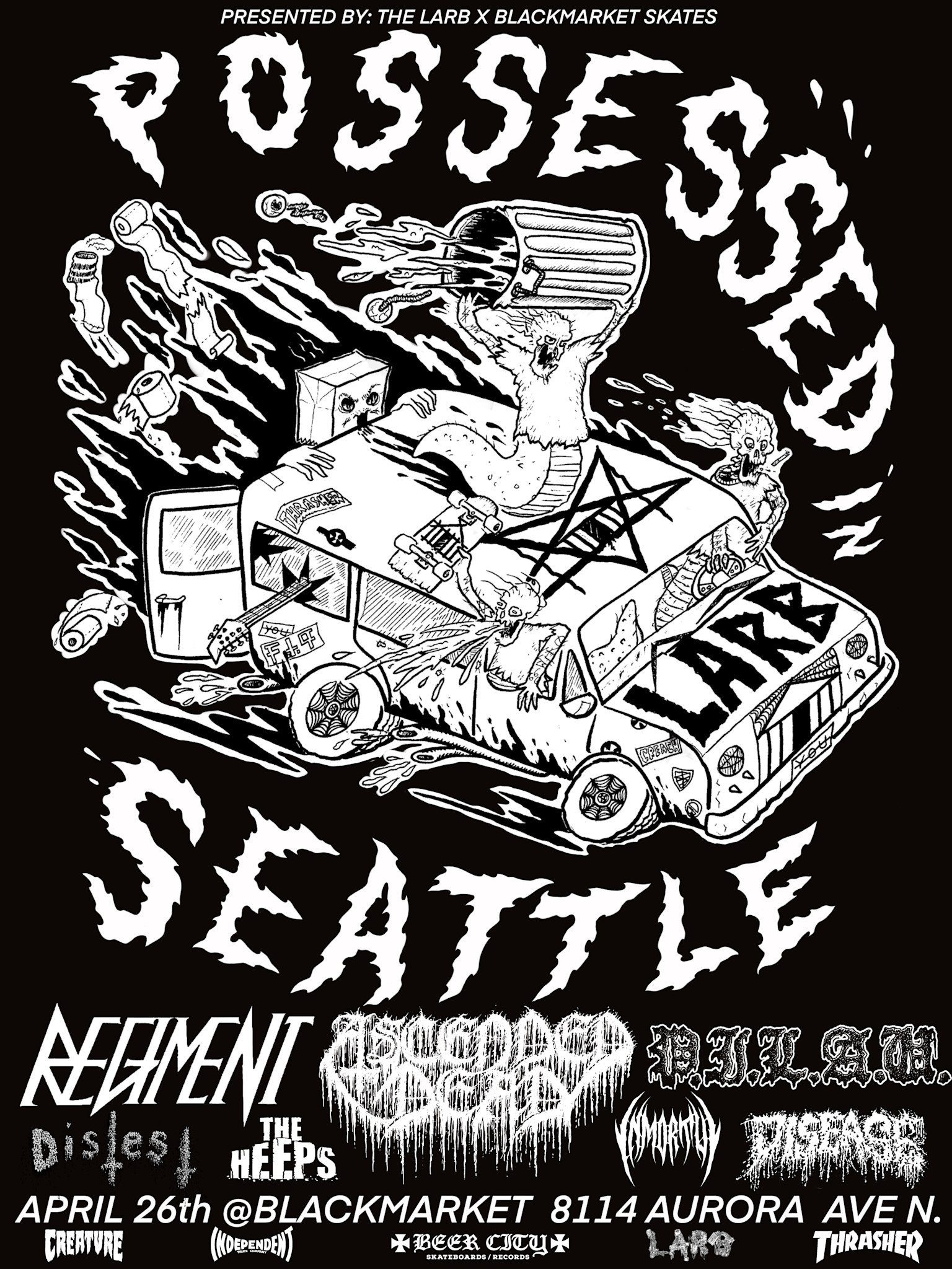 BEHOLD. Larb “Possessed In Seattle” now possessed to the Max! with the Diabolical addition of Ascended Dead and Inmortui bringing the Black to the thrash-n-grinding hell of a time. Activate your posse and join us! New stage, Bowl sesh Debauchery, Sinful event merch and gluttonous raffle from our sponsors.. Creature skateboards, Independent Trucks, Beer City Skateboards, Thrasher Magazine and more.